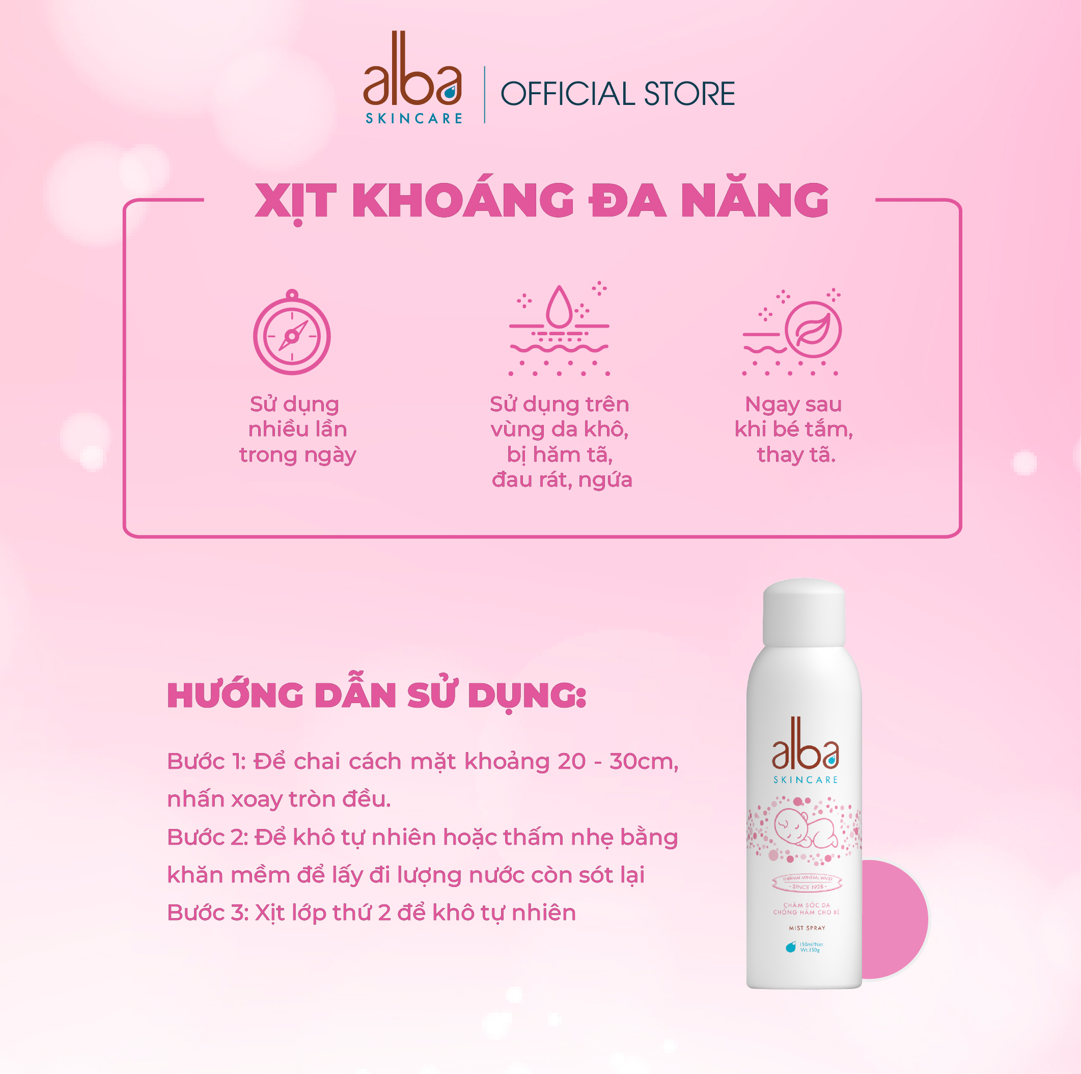 - GIỚI THIỆU SẢN PHẨM Làn da của trẻ nhỏ rất mỏng manh và dễ bị kích ứng trước các tác nhân bên ngoài như thời tiết, quần áo, mỹ phẩm, hoặc chất tẩy rửa. Xịt khoáng Alba Skin Care dành cho bé là sản phẩm chuyên biệt giúp cấp ẩm, làm dịu và bảo vệ làn da non nớt của trẻ, hỗ trợ giảm tình trạng hăm, rôm sảy, viêm da và giữ cho da bé luôn mềm mại, khỏe mạnh.