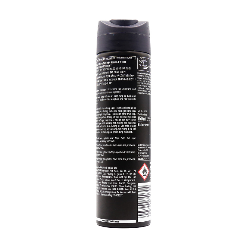 Xịt khử mùi ngăn vệt ố vàng cho nam Nivea Men Invisible Black&White với công thức tiên tiến giúp giảm hình thành vệt ố vàng trên áo. Giúp giảm tiết mồ hôi và khử mùi hiệu quả suốt 48 giờ. Mùi hương nam tính, mạnh mẽ. Thiết kế nhỏ gọn, tiện lợi mang theo mọi nơi. Thành phần Butane, Isobutane, Propane, Cyclomethicone, Aluminum Chlorohydrate, Isopropyl Palmitate, C12-15 Alkyl Benzoate, Parfum, Disteardimonium Hectorite 0,3, Octyldodecanol 0,12, Propylene Carbonate, Dimethiconol, Palmitamidopropyltrimonium Chloride, Propylene Glycol. Công dụng Xịt ngăn mùi dùng cho vùng da dưới cánh tay dành cho nam, giúp da khô thoáng, dưỡng ẩm da và giúp giảm vệt ố vàng trên áo sau khi dùng sản phẩm. Cách sử dụng: Lắc đều trước khi sử dụng. Để ở khoảng cách 15cm và xịt theo đường zic-zac trên cơ thể. Bảo quản Nơi khô ráo thoáng mát, tránh ánh nắng trực tiếp. Dung tích: Chai 50ml Xuất xứ thương hiệu: Đức Sản xuất tại: Thái Lan Nhà sản xuất: CYBERPAX CO.,LTD Công ty chịu trách nhiệm về SP: Công ty TNHH BEIERSDORF Việt Nam Số Giấy công bố: 37134/17/CBMP-QLD