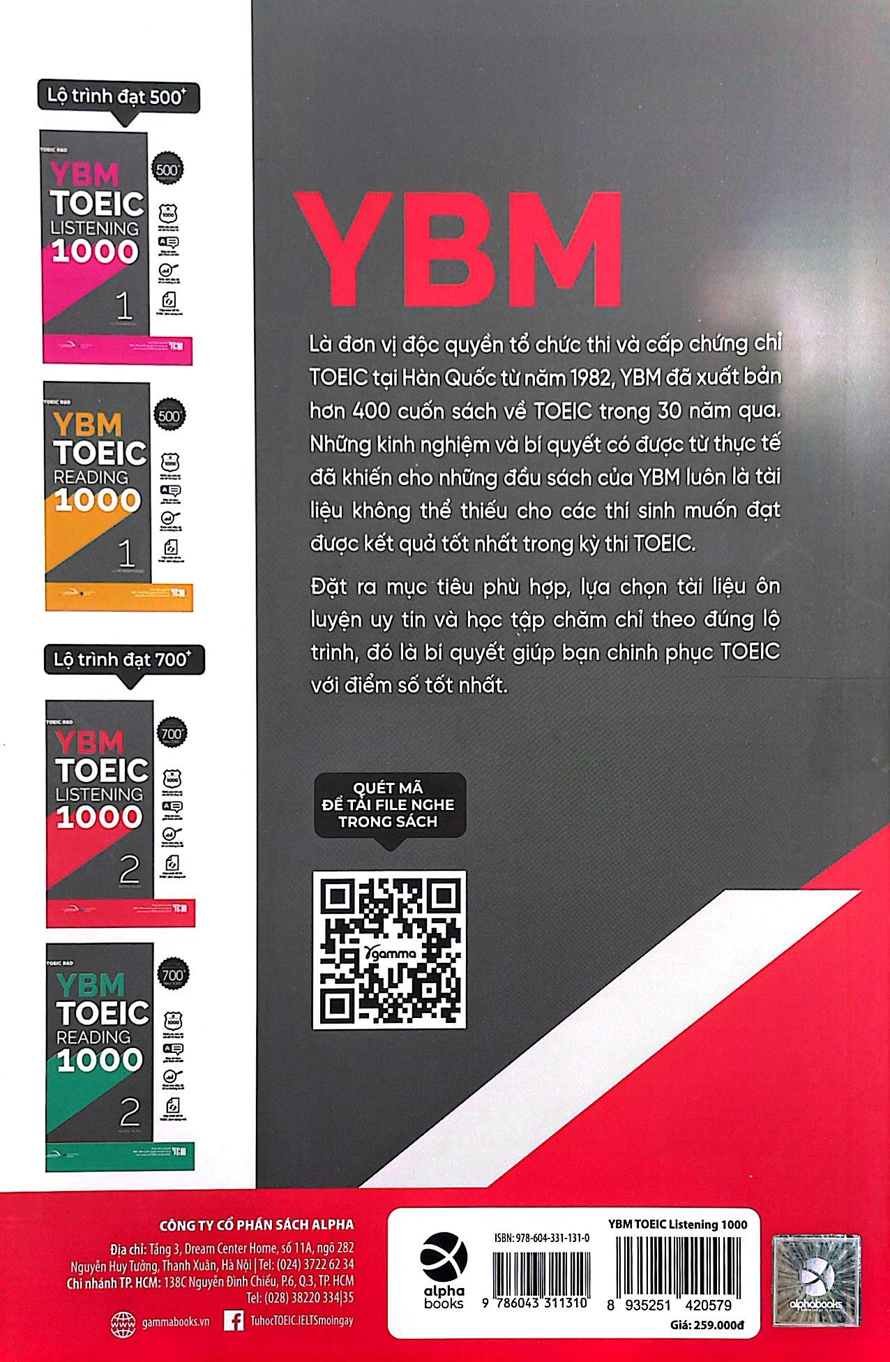 YBM TOEIC Listening 1000 là bộ sách giúp người học tự ôn luyện cho phần thi Nghe của bài thi TOEIC. Trong đó, Vol. 1 được thiết kế dành cho người học nhắm tới mục tiêu đạt 500+ điểm TOEIC và Vol. 2 dành cho người học có mục tiêu đạt 700+. (Mức 450 điểm là yêu cầu đối với sinh viên tốt nghiệp cao đẳng; mức 650 điểm là yêu cầu chung đối với sinh viên tốt nghiệp đại học hệ đào tạo 4-5 năm, nhân viên, trưởng nhóm tại các doanh nghiệp có yếu tố nước ngoài).