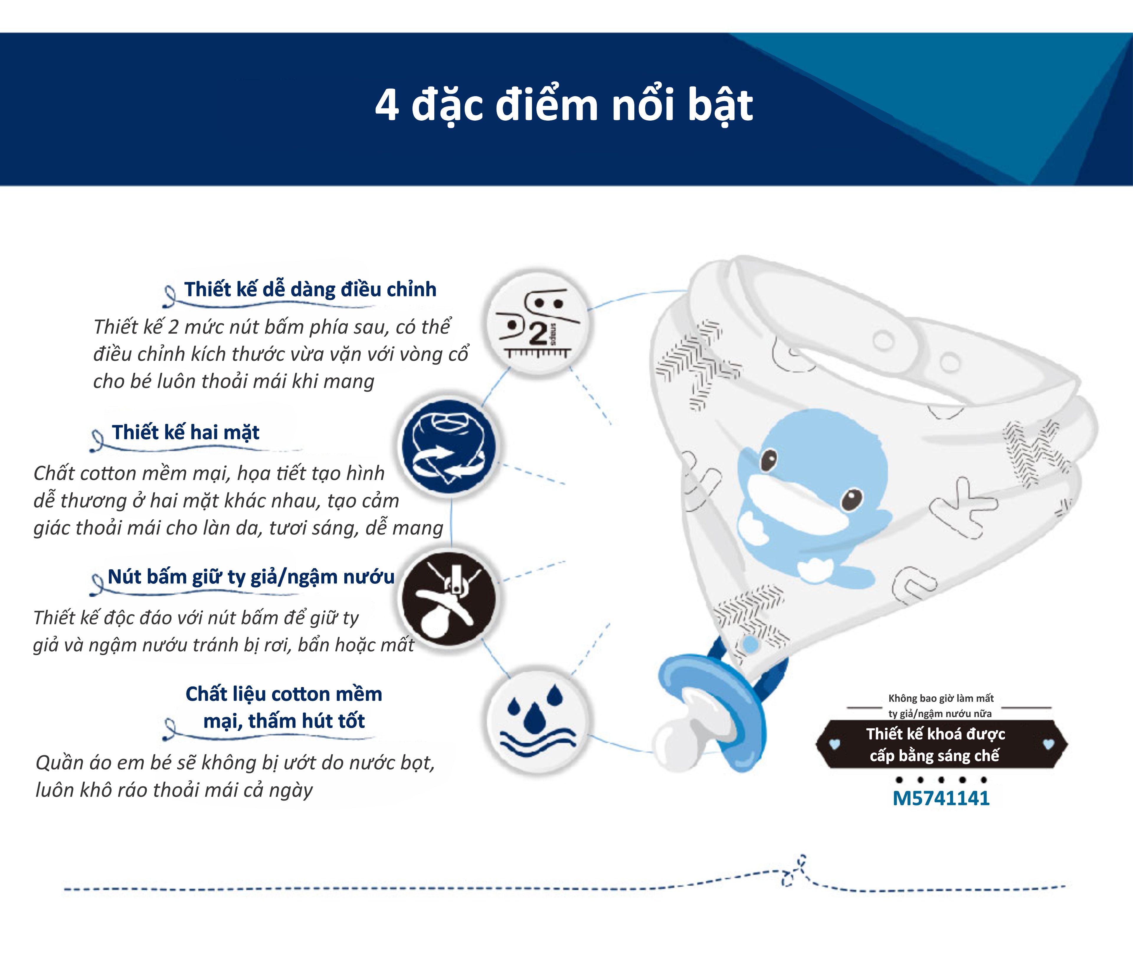 - Thiết kế độc đáo với nút bấm giữ ty ngậm/ngậm nướu phía dưới, bảo đảm chúng luôn sạch sẽ và không bị mất trong quá trình bé sử dụng;