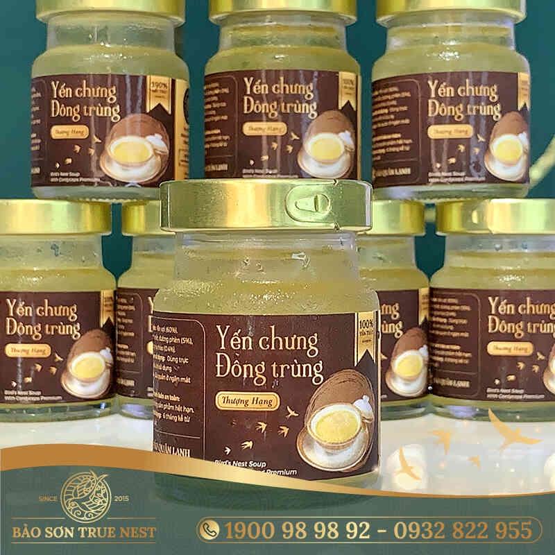 Với sản phẩm tươi sống, trọng lượng thực tế có thể chênh lệch khoảng 10%. BẢO SƠN TRUE NEST - NHẤT PHẨM BÁT TRÂN Sản phẩm: Yến Chưng Đông Trùng Hạ Thảo. - ĐẶC ĐIỂM: