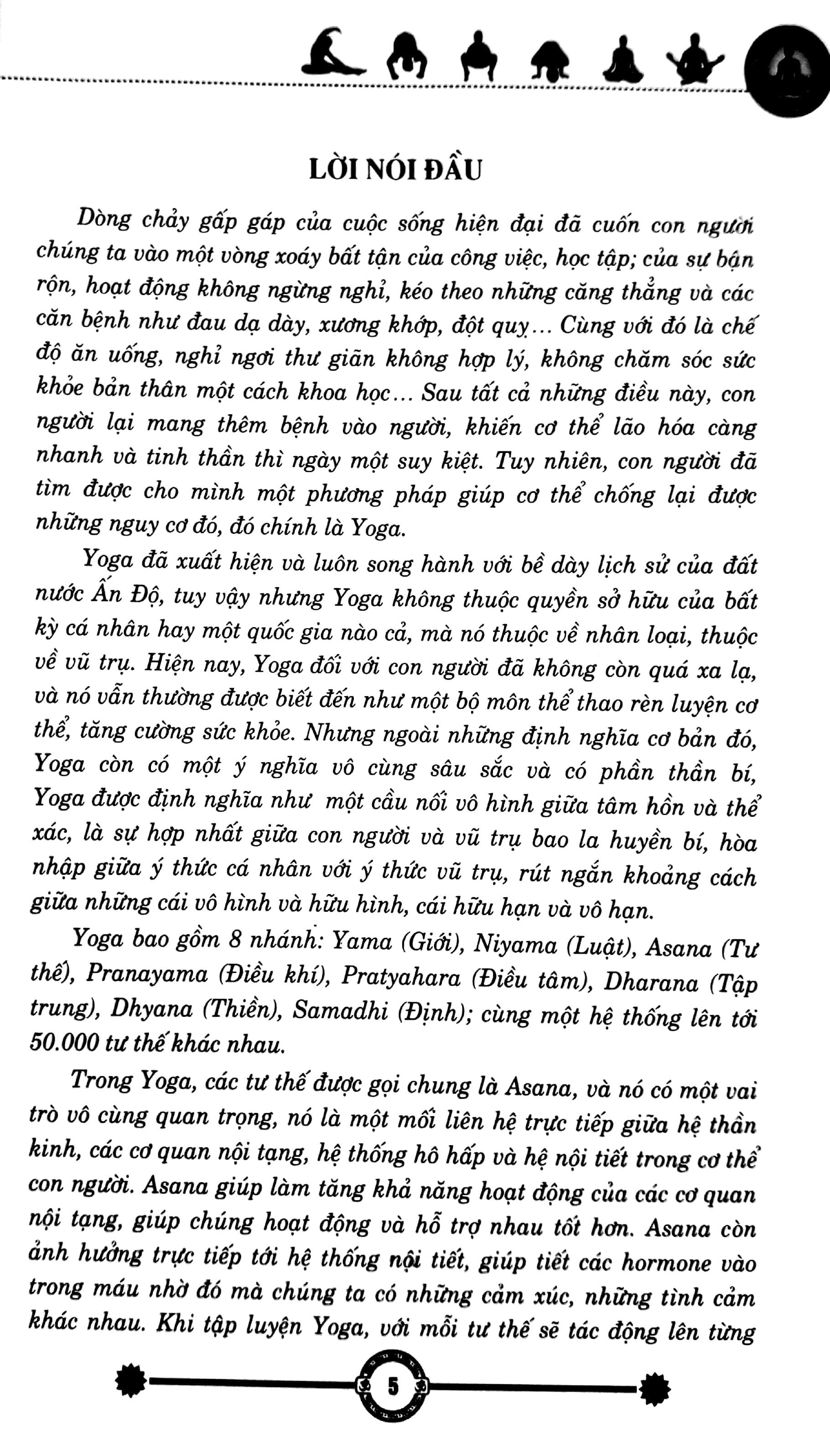 Dòng chảy gấp gáp của cuộc sống hiện đại đã cuốn con người chúng ta vào một vòng xoáy bất tận của công việc, học tập; của sự bận rộn, hoạt động không ngừng nghỉ, kéo theo những căng thẳng và các căn bệnh như đau dạ dày, xương khớp, đột quỵ Cùng với đó là chế độ ăn uống, nghỉ ngơi thư giãn không hợp lý, không chăm sóc sức khỏe bản thân một cách khoa họ Sau tất cả những điều này, con người lại mang thêm bệnh vào người, khiến cơ thể lão hóa càng nhanh và tinh thần thì ngày một suy kiệt. Tuy nhiên, con người đã tìm được cho mình một phương pháp giúp cơ thể chống lại được những nguy cơ đó, đó chính là Yoga.