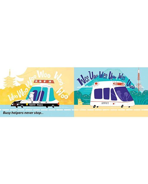 Cities around the world are always on the move, and this lively book puts little ones in the driver's seat with a cacophony of sounds right on the streets of some of the most exciting metropolises on the planet, including San Francisco, Seattle, New York, Tokyo, London, Vancouver, and more. The sturdy pages feature fire trucks, diggers, motorcycles, and boats, as well as police cars (weeeoooeee!), airplanes (swish!), and strollers in the park (whir, whir!). Zoom! Beep! Vroom! Busy Cities will surely charm any young vehicle enthusiast and the many tots that are intrigued by life in the big city.